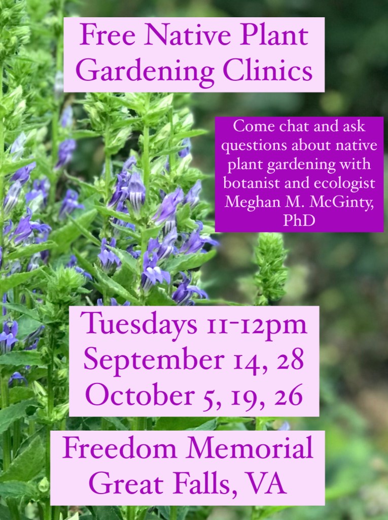 5 days only! Tuesdays 11-12pm on 9/14, 28 and 10/5, 19, 26 at Freedom memorial in Great Falls VA. This will be a casual question-driven clinic so bring your inquiries! Please register to attend by sending an email to CultivateNature@gmail.com.